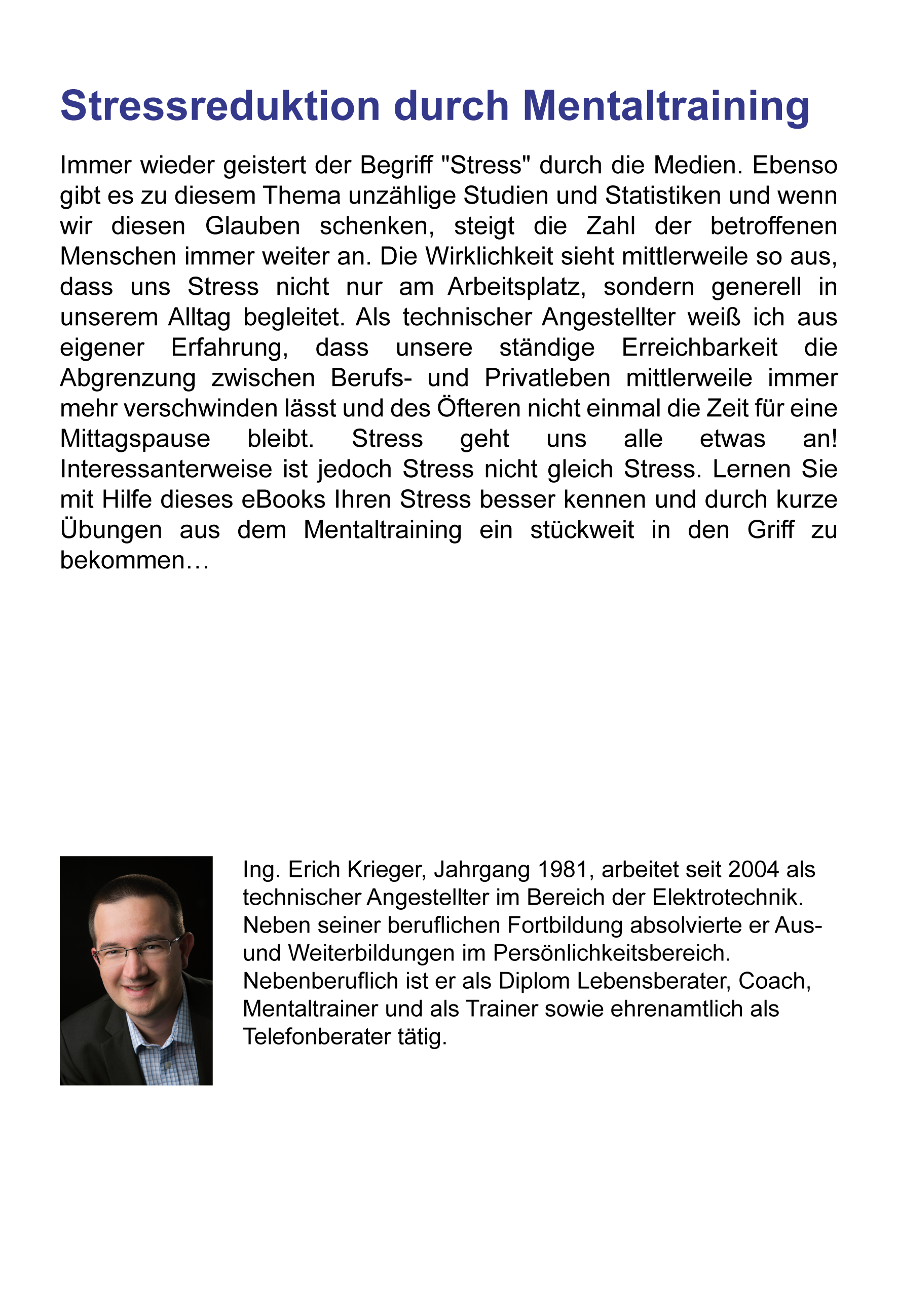 Ing. Erich Krieger, Jahrgang 1981, arbeitet seit 2004 als technischer Angestellter im Bereich der Elektrotechnik. Neben seiner beruflichen Fortbildung absolvierte er Aus- und Weiterbildungen im Persönlichkeitsbereich. Nebenberuflich ist er als Diplom Lebensberater, Coach, Mentaltrainer und als Trainer sowie ehrenamtlich als Telefonberater tätig.